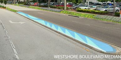 A portion of this project is the painting of the concrete medians with matching colors to the Westshore District. TTDG chose a geometric pattern to match the walls on I-275 which bisects the district as well as suing a long slowing curvilinear pattern in the center portions of the medians. This is to add color and brighten up the usually dull and dark medians. The concrete stain is durable and cost effective solution for public art.